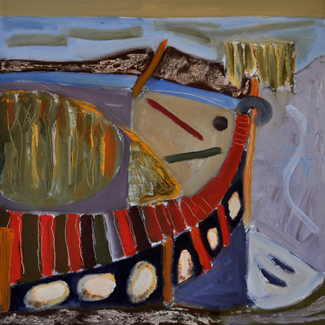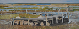 The first painting is clearly a landscape, and shows a view of the jetty at low water.This painting made use of evidence of various kinds, including memories, and an old photograph taken several years ago. The composition was worked out using drawings. Some of the original underpainting in acrylic shows through in places. The other two are less figurative.