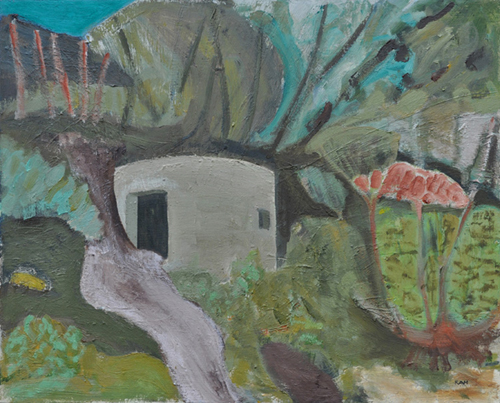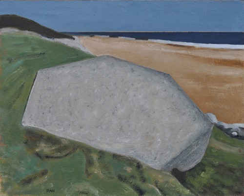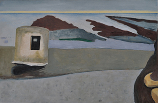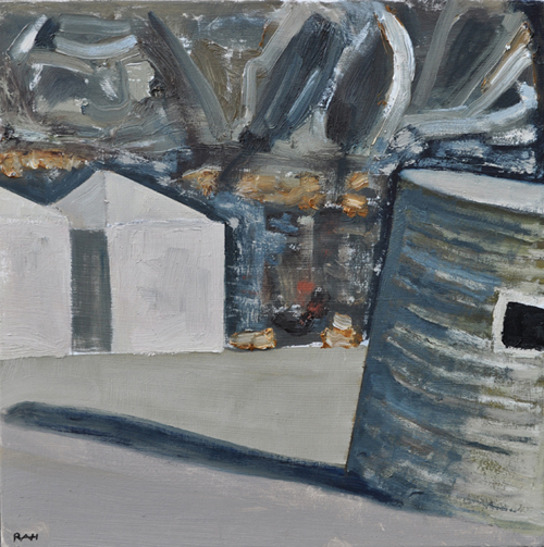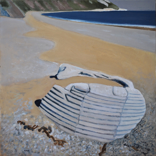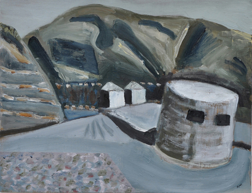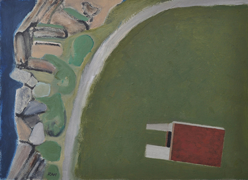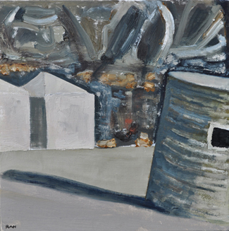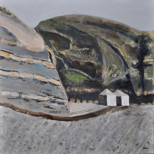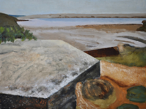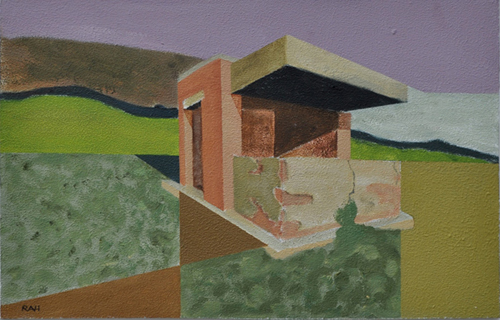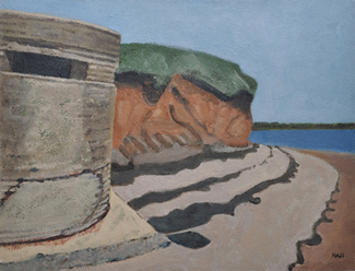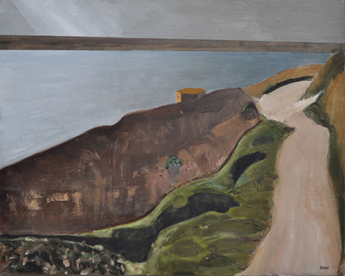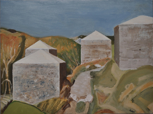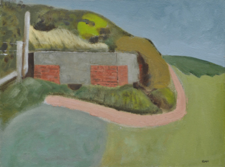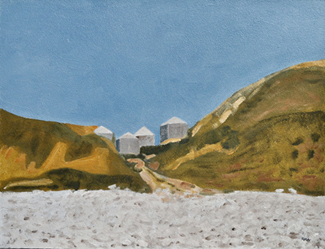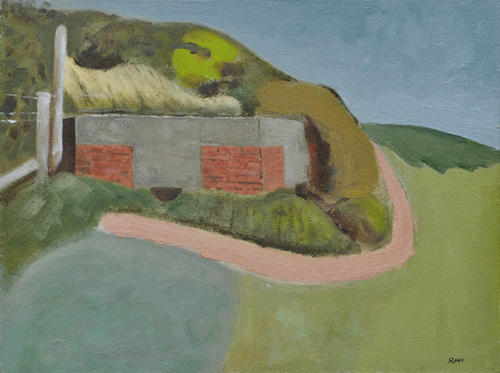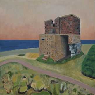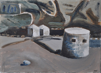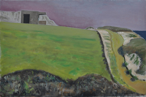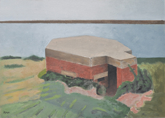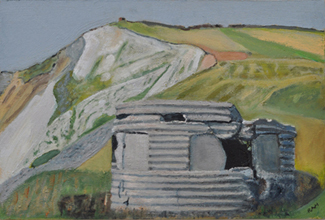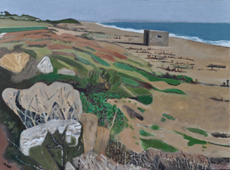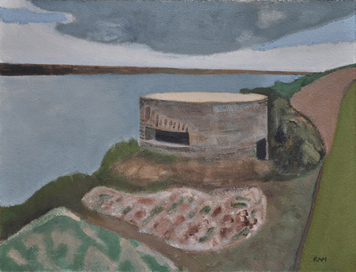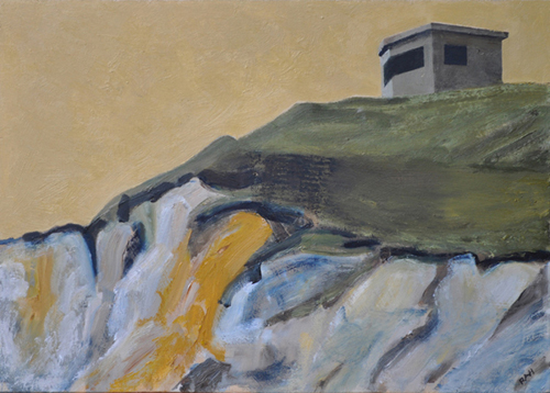 These paintings reflect the current state of several WW2 artefacts at actual locations in coastal Dorset. Though a minority of these buildings are in fairly good repair, too many are not. Some have been deliberately damaged by authorities (e.g. removal of pillbox roof) for a variety of reasons, such as preventing access to a dangerous structure. It would be good to see more of them protected as monuments.